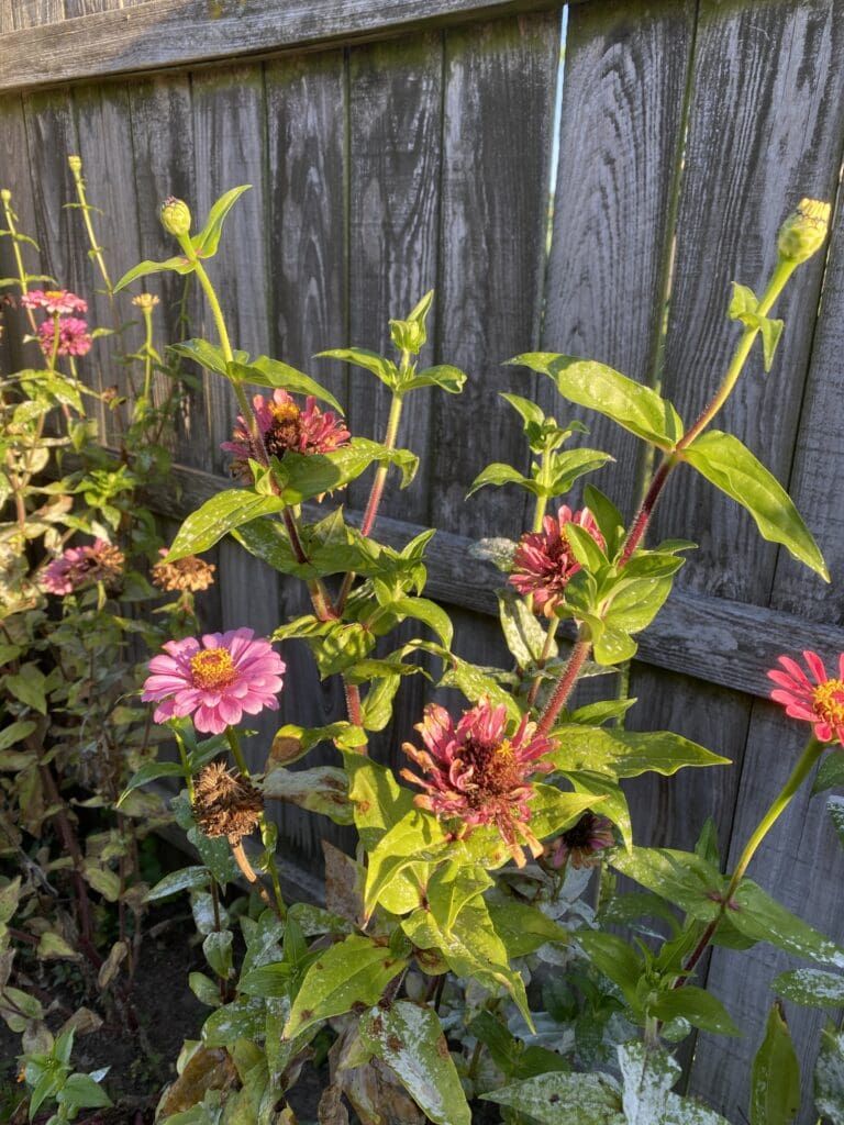The zinnias and marigolds growing along the back fence are well past their prime.